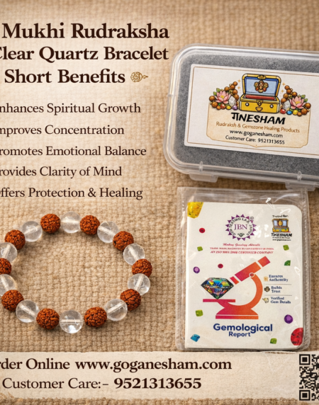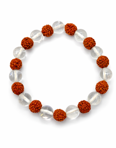 The Ganesham 5 Mukhi Rudraksha & Clear Quartz Bracelet is a powerful spiritual healing bracelet made from natural 5 Mukhi Rudraksha beads and Clear Quartz (Sphatik) crystals. This bracelet is designed to promote mental clarity, positive energy, spiritual protection, and emotional balance.