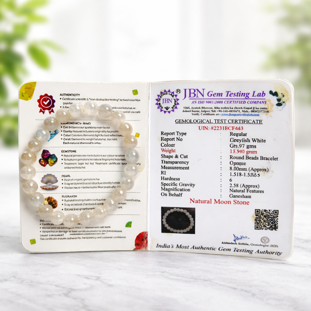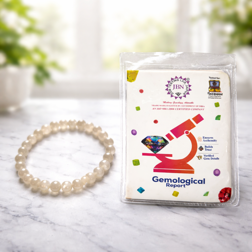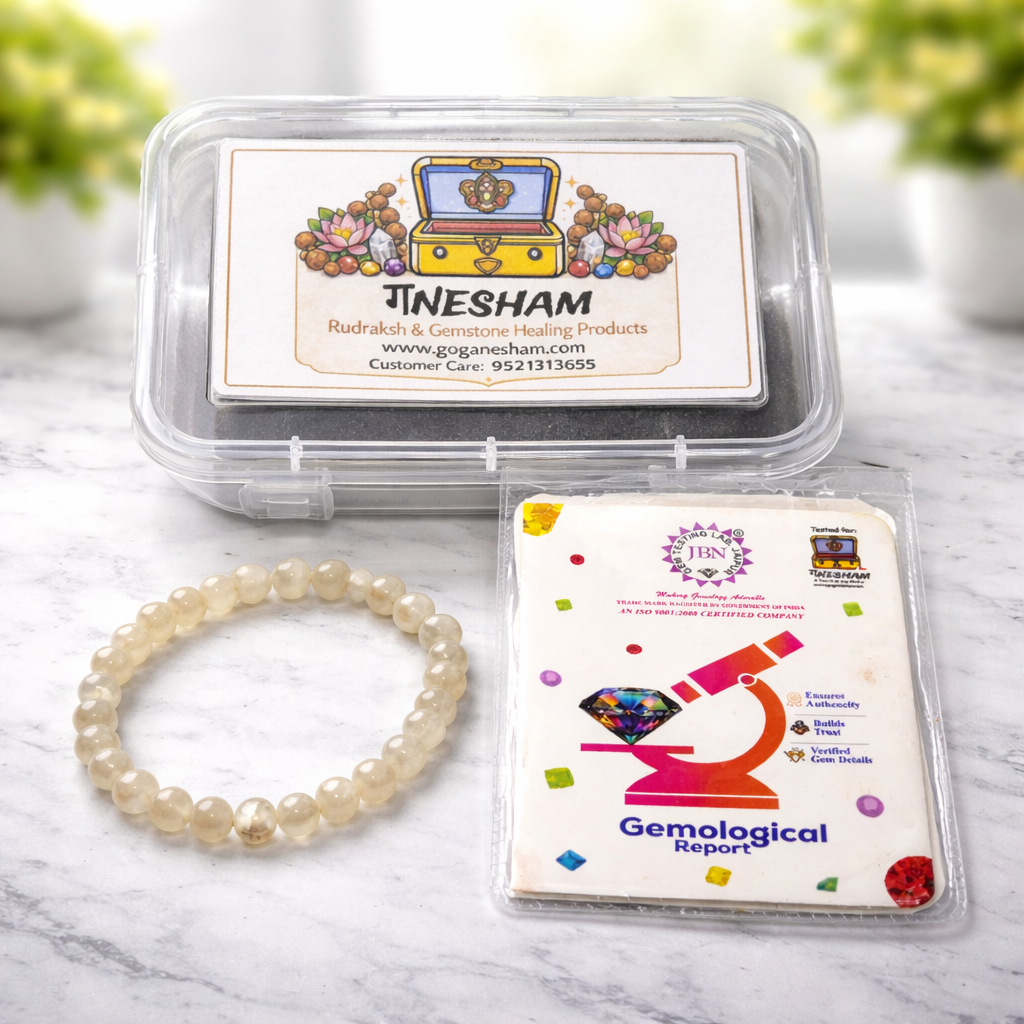 Each bracelet comes with a JBN Gem Testing Lab Certification, ensuring authenticity and superior quality. Offered by the trusted Ganesham Brand, it reflects purity, craftsmanship, and spiritual significance.