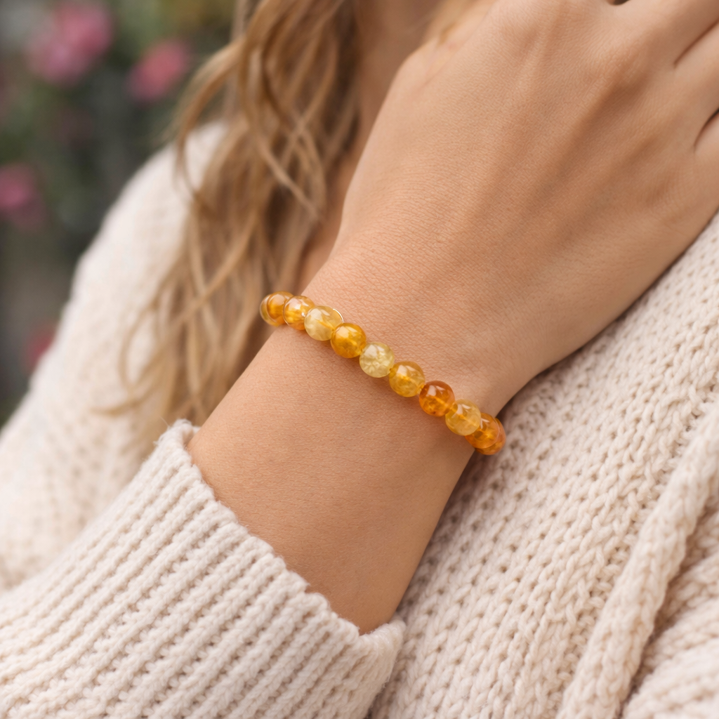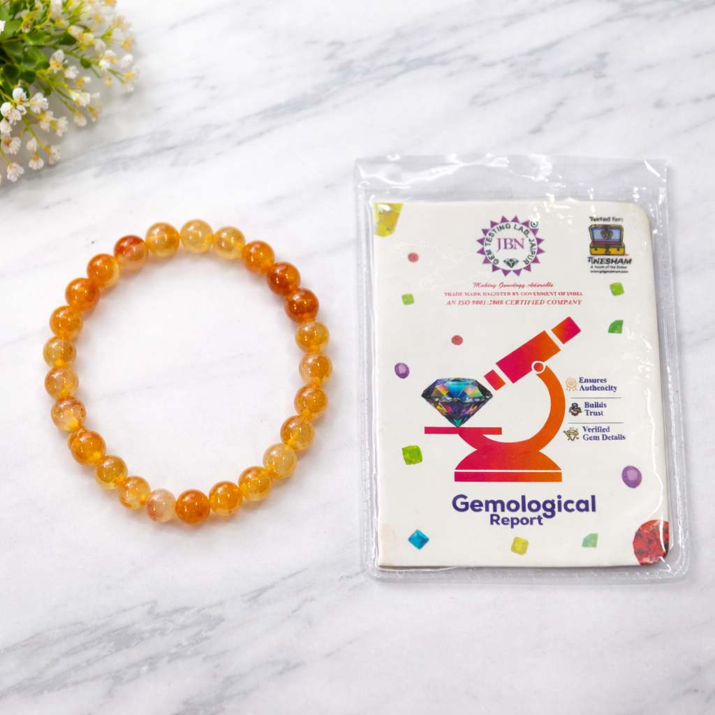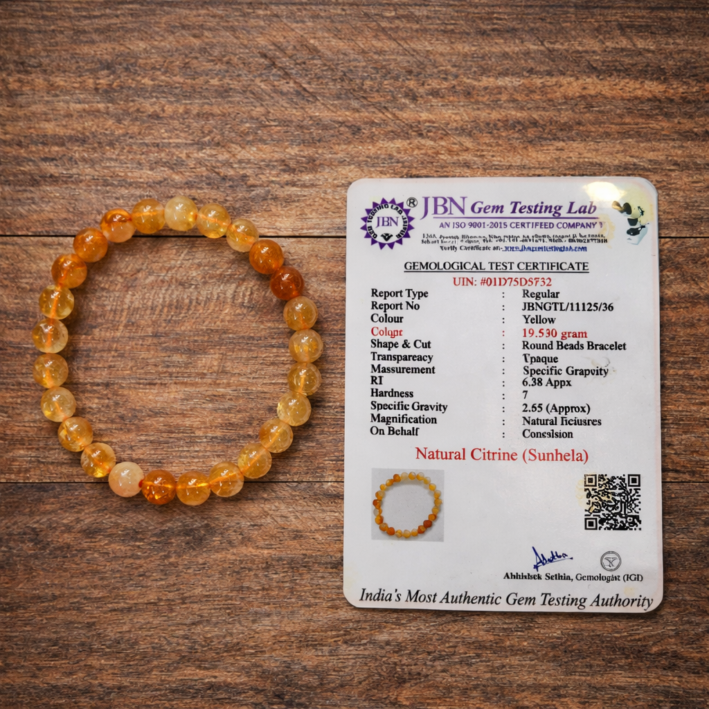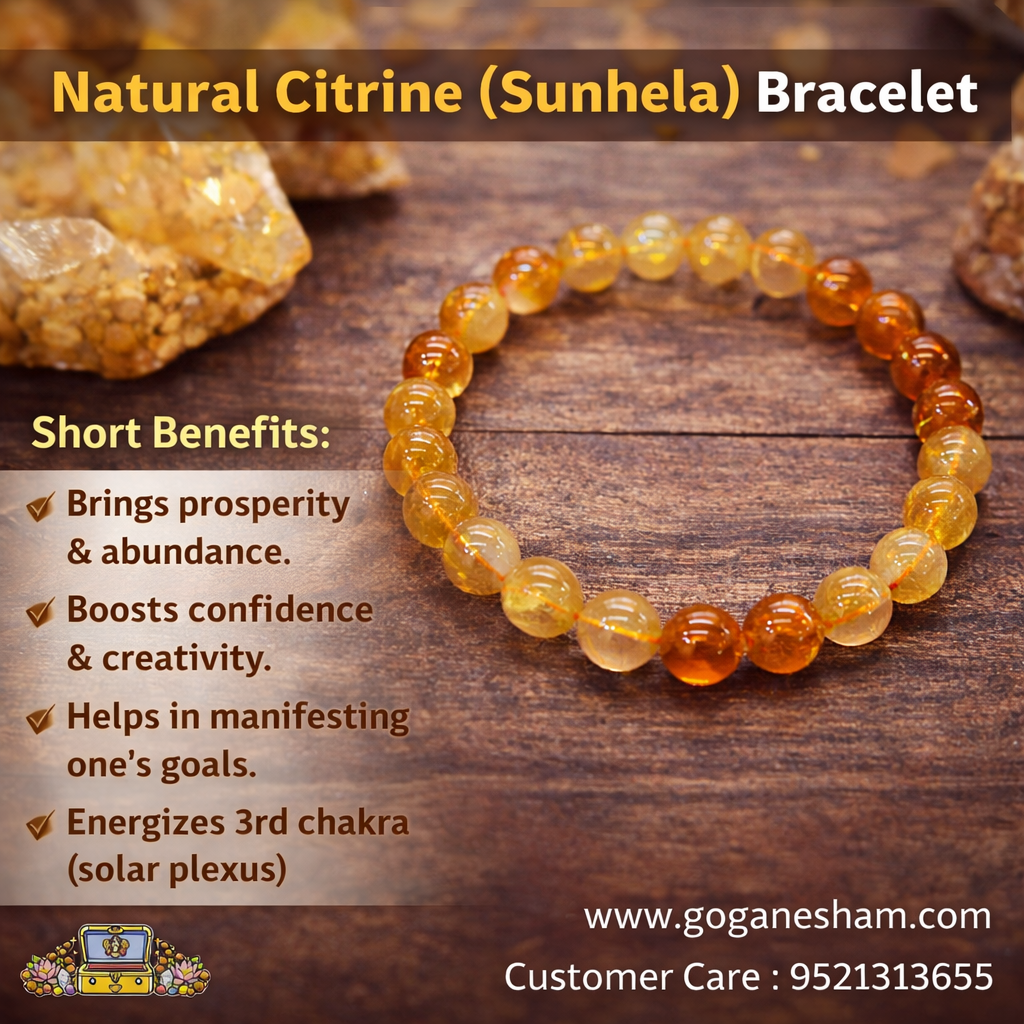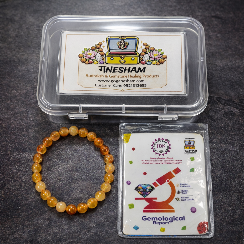 Ganesham Natural Citrine Bracelet is a powerful healing gemstone bracelet known for attracting wealth, success, and positive energy. Made from premium quality natural citrine (sunhela) beads, this bracelet is certified by JBN Gem Testing Lab Jaipur, ensuring authenticity and trust.