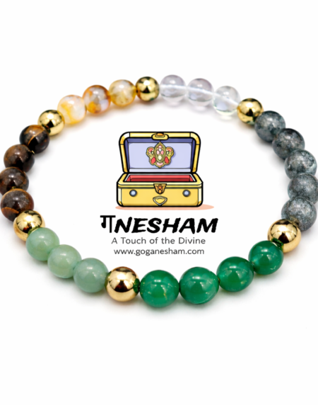 Ganesham Dhan Yog Bracelet Powerful combination gemstone bracelet designed for wealth attraction, confidence, positivity, and energy balance. Made with Clear Quartz, Citrine, Pyrite, Golden Hematite, Green Aventurine and Tiger Eye — easy wearable daily bracelet certified by JBN Gem Testing Lab Jaipur.