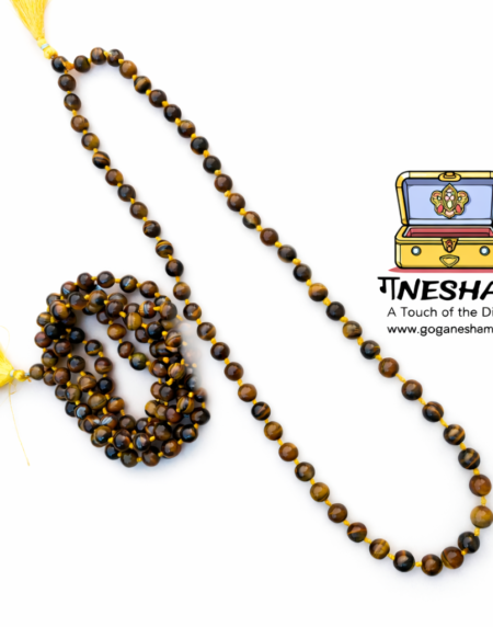 Enhance your inner strength and spiritual focus with GANESHAM Tiger Eye 54+1 Beads Mala. Crafted from natural, lab-certified Tiger Eye gemstones, this powerful mala is ideal for neck wearing as well as mantra chanting (jaap). Known as the stone of courage and protection, Tiger Eye helps attract success, confidence and
