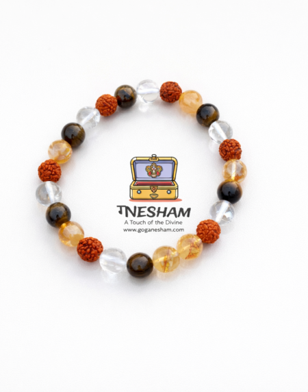 Attract wealth, boost confidence, remove negativity and balance your energy with Ganesham Tiger Eye, Citrine, Rock Crystal (Sphatik) & 5 Mukhi Rudraksha Bracelet. This powerful combination is specially designed for money growth, mental strength, positivity and spiritual protection.