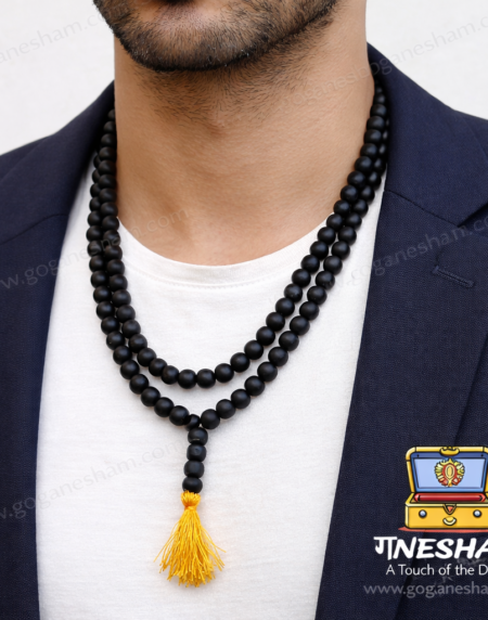 Enhance your spiritual energy and mental strength with GANESHAM Black Onyx 54+1 Beads Jap Mala. Made from premium natural Black Onyx gemstones and certified by JBN Gem Testing Lab Jaipur, this mala is ideal for meditation, mantra chanting, and daily neck wear for protection and emotional balance.